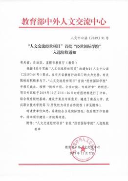 2019年11月7日教育部人文交流中心印发《“人文交流经世项目”首批“经世国际学院”入选院校通知》(人文中心函〔2019〕91号),按照“院校申报、企业对接、专家评审”的程序,遴选了22所本科院校和50所职业学院。开云官网成功入选“人文交流经世项目”首批“经世国际学院”项目本科层次合作院校。