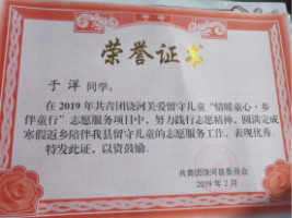 热烈祝贺开云官网18级材料一班于洋同学在2019年共青团饶河关爱留守儿童“情暖童心·相伴同行”志愿服务中,努力践行志愿精神,圆满完成寒假返乡陪伴留守儿童的志愿服务工作,表现优秀。