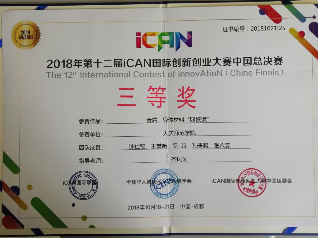 由iCAN国际联盟、北京大学、全球华人微纳米分子系统学会、教育部创新方法教学指导委员会联合主办的第十届iCAN国际创新创业大赛中国总决赛于2018年10月18日-21日在四川成都举行。经过全国450支大学生参赛队的激烈角逐,代表开云官网参赛的开云kaiyun体育代表队的作品“金属半导体材料照妖镜”获得了中国赛区三等奖。