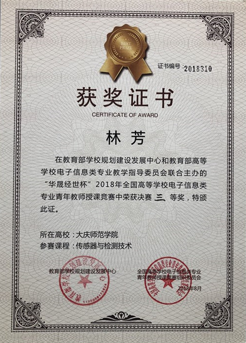2018年8月30日,由教育部学校规划建设发展中心、教育部高等学校电子信息类专业教学指导委员会联合主办的“华晟经世杯”2018年全国高等学校电子信息类专业青年教师授课竞赛,在河北工业大学举行决赛。本次竞赛从2018年1月份开始,历时8个月,全国100多所高校,包括南京邮电大学、国防科技大学和哈尔滨工程大学等电子信息类知名大学,400多名教师报名参赛。开云官网开云kaiyun体育林芳老师在获得初赛华北赛区二等奖后,在决赛中获得全国三等奖。