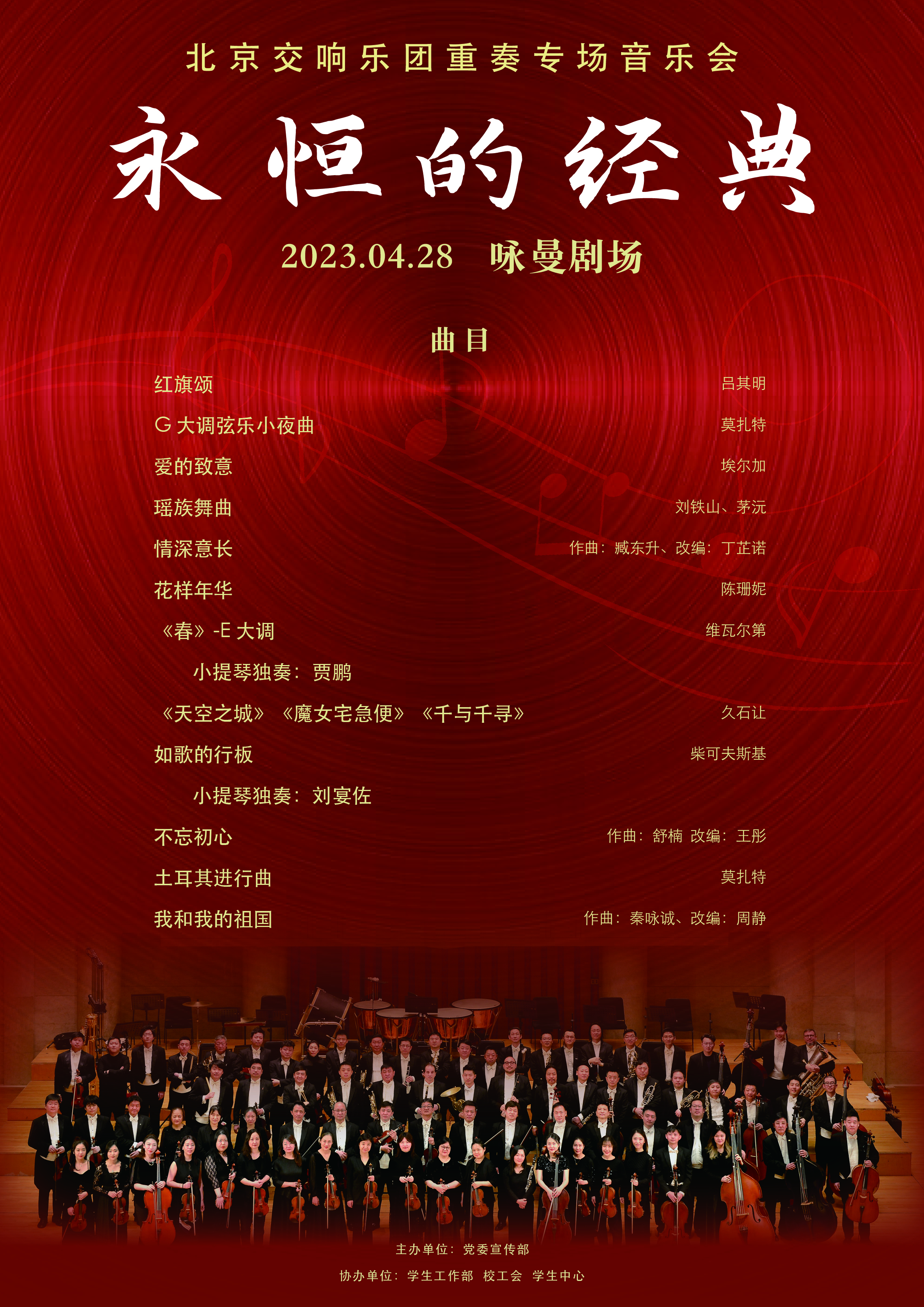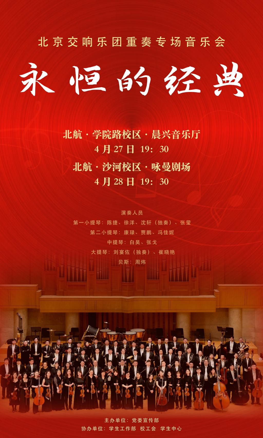 “永恒的经典”——北京交响乐团重奏专场音乐会将于周四(4月27日)19:30,周五(4月28日)19:30先后在学院路校区晨兴音乐厅、沙河校区咏曼剧场上演。