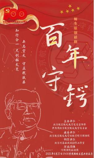 为庆祝中国共产党成立100周年,繁荣校园美育文化传播,弘扬空天报国情怀,传承守正出新精神,北航学院守锷书院师生原创话剧《百年守锷》应邀作为北航首届艺术节“大师剧”系列首场演出,将于4月27日晚19:00在北航晨兴音乐厅准时上演。
