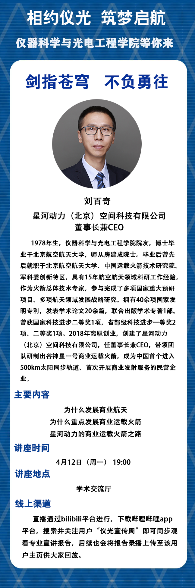 星河动力董事长兼CEO刘百奇讲座预告