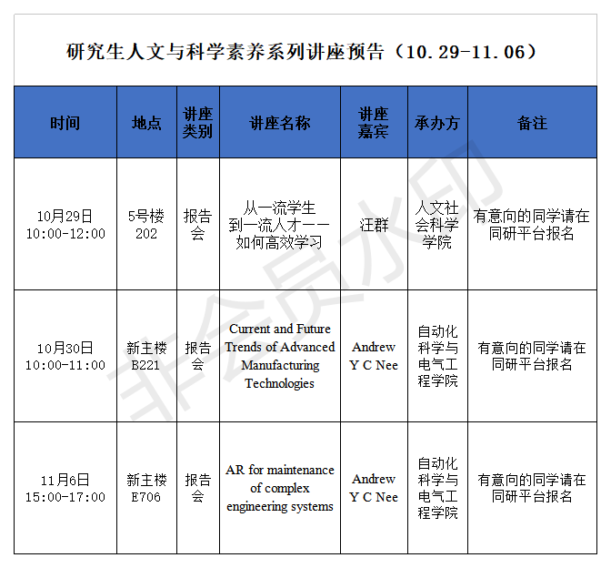 为提升我校研究生文化素养,培养研究生科学精神,促进研究生学术交流,营造具有传统与时代结合、人文与科学融合的研究生创新文化,党委研究生工作部于2016年3月启动我校研究生人文与科学素养提升平台建设。每周在校园网和研究生院官网上对近期即将举行的人文与科学素养讲座、报告或相关活动进行预告,欢迎感兴趣的同学积极参与。
