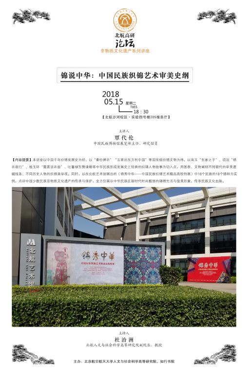 本讲座以中国千年织锦发展史为经,以“素纱禅衣”“五星出东方利中国”等国宝级织锦文物为纬,以宋玉“东家之子”、项羽“锦衣夜行”、杨玉环“霓裳羽衣曲”、吐蕃禄东赞请婚等中华民族形成发展史上经典的织锦人物故事为切入点,用图表、文物阐明不同朝代的审美逻辑线条、不同历史人物的织锦美学观。同时,以在北航艺术馆展出的《锦秀中华——中国民族织锦艺术精品高校特展》中16个民族的18个锦种为实例,点评中国少数民族非物质文化遗产的传承与保护,全方位展示中华民族在新时代时尚靓丽的锦绣生活与俊美形象,传承民族文化血脉。
