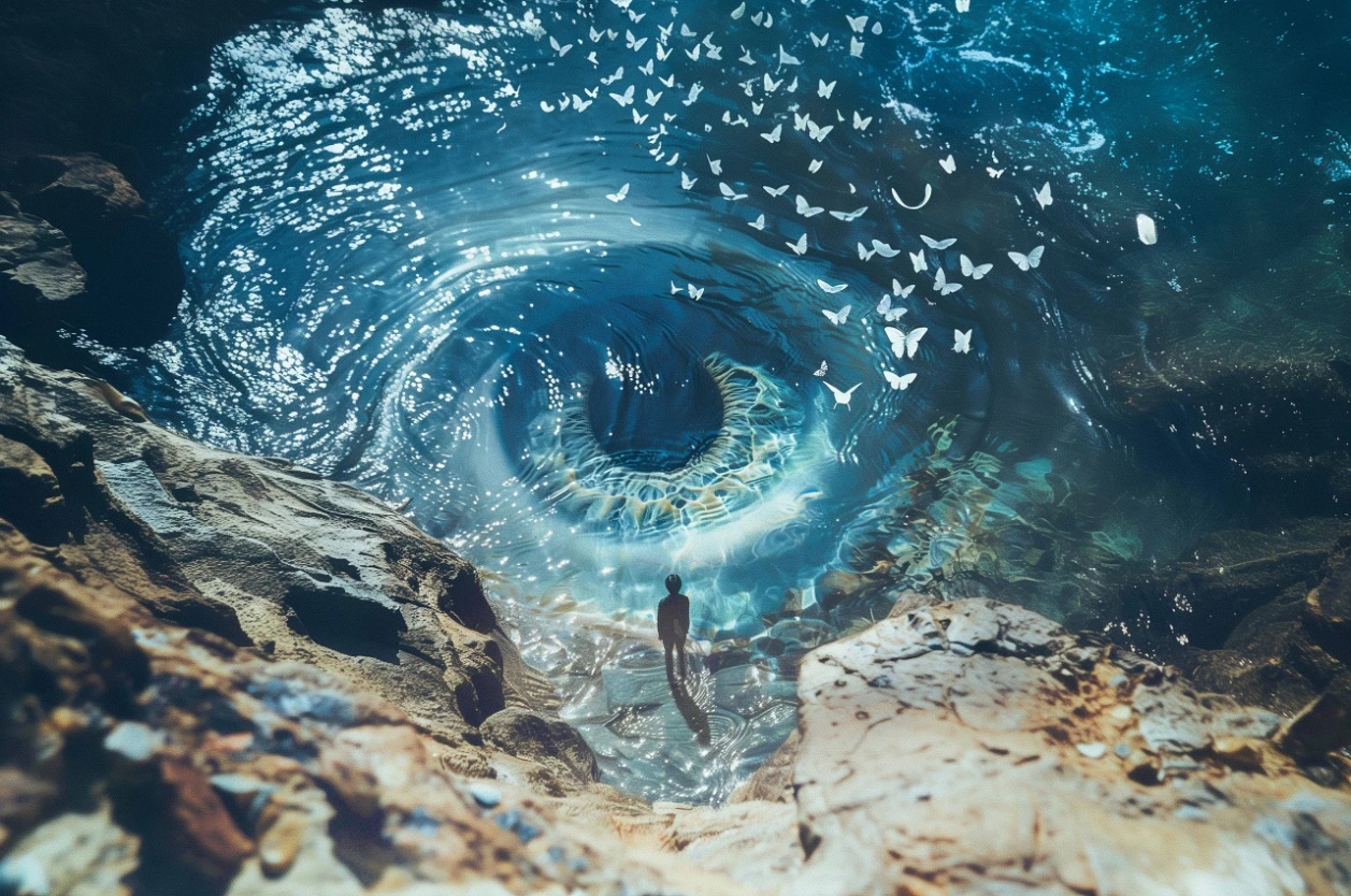 从庄子“逍遥游”的远古遐想到“神舟”飞天的现实壮举,中华民族对宇宙的追问从未止息。展览以“天问”“云寄锦书”“楚天极目”“神州鲲鹏”“沧海蝶影”五大单元,串联神话、自然、科技与未来。“日月同辉”与“神舟飞天“影像并置,纪实摄影与AI创作对话——这些碰撞不仅再现航空航天事业的辉煌历程,更叩问艺术与科技的共生关系:技术如何拓展创作边界?人文又如何为理性注入温度?