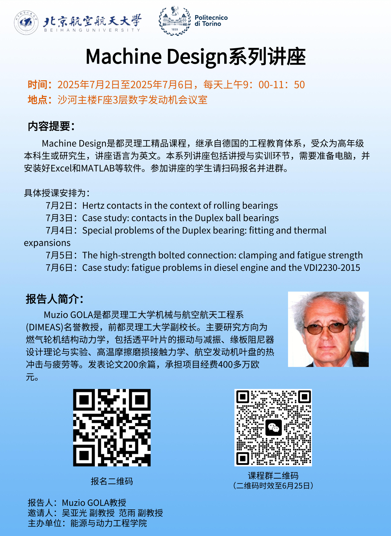Machine Design是都灵理工精品课程,继承自德国的工程教育体系,受众为高年级本科生或研究生,讲座语言为英文。本系列讲座包括讲授与实训环节,需要准备电脑,并安装好Excel和MATLAB等软件。参加讲座的学生请扫码报名并进群(详见附件海报)。