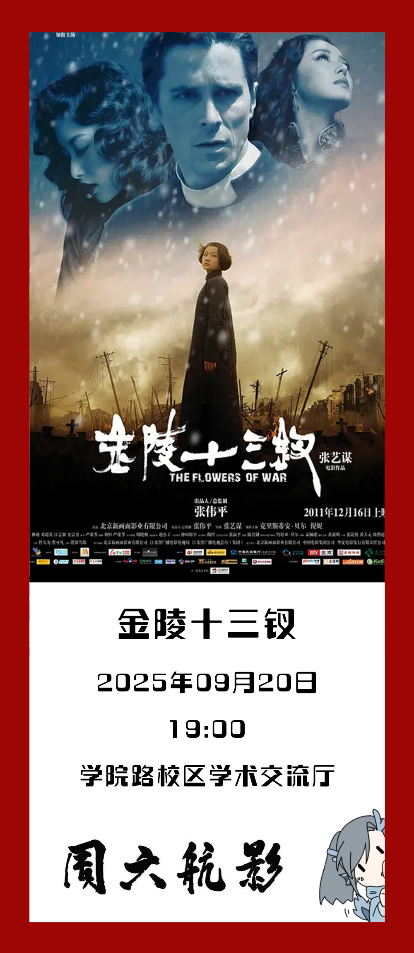 「周六航影」第二周让我们一起走进《金陵十三钗》看硝烟弥漫的南京城里不同身份的人如何在绝境中抉择,感受人性微光如何穿透黑暗。