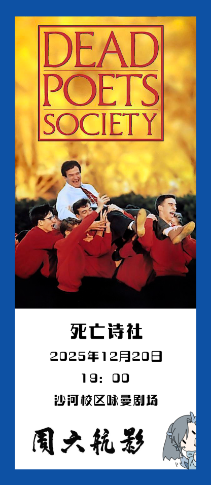 本学期航影最后一周,让我们一起走进《死亡诗社》,在一句句诗词之中,重燃生活的激情,在排名定义的价值外,听见青春本真的回响。