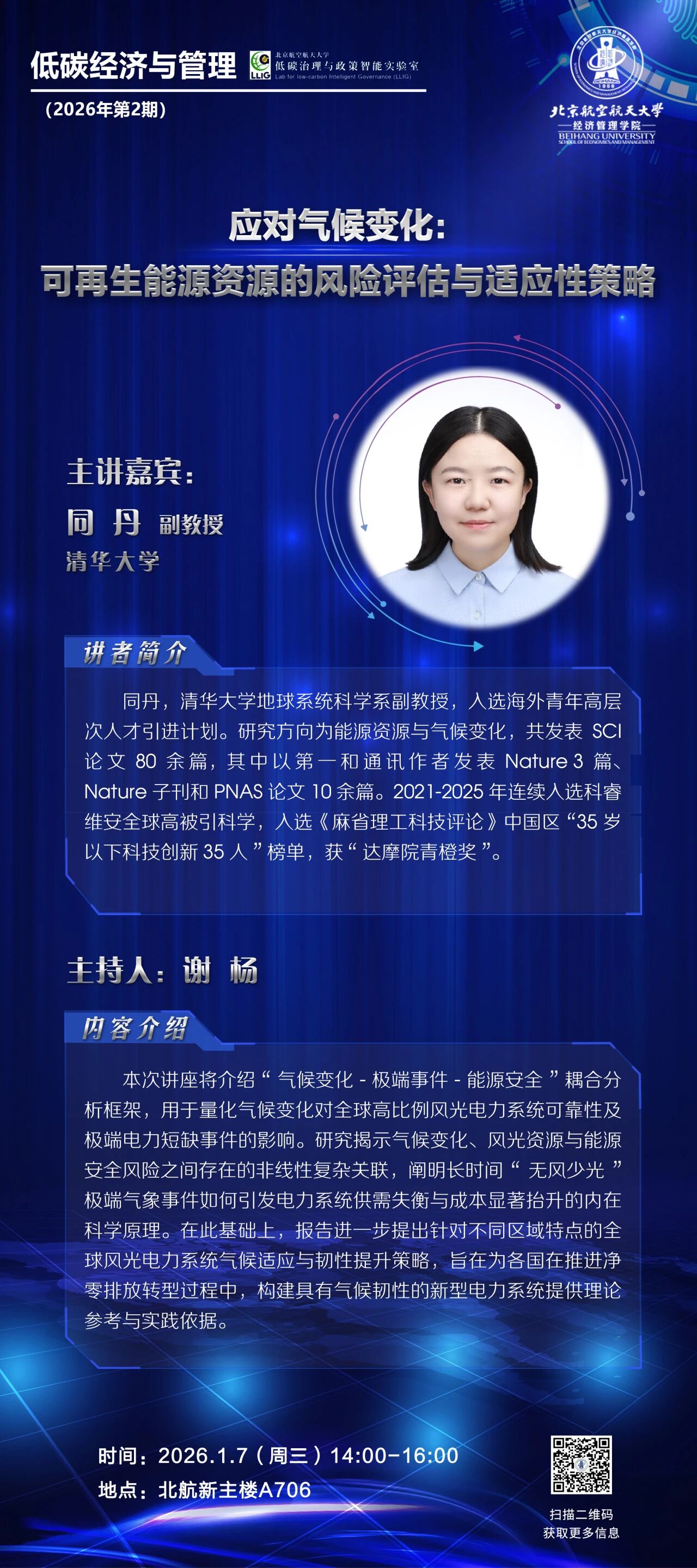 本次讲座将介绍"气候变化-极端事件-能源安全"耦合分析框架,用于量化气候变化对全球高比例风光电力系统可靠性及极端电力短缺事件的影响。研究揭示气候变化、风光资源与能源安全风险之间存在的非线性复杂关联,阐明长时间"无风少光"极端气象事件如何引发电力系统供需失衡与成本显著抬升的内在科学原理。在此基础上,报告进一步提出针对不同区域特点的全球风光电力系统气候适应与韧性提升策略,旨在为各国在推进净零排放转型过程中,构建具有气候韧性的新型电力系统提供理论参考与实践依据。