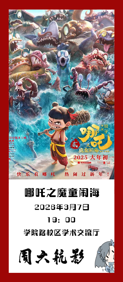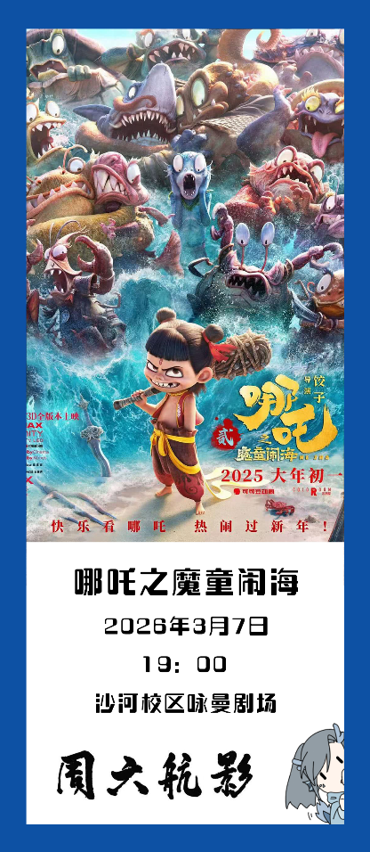 新学期,新启程,周六航影。如约而至。「周六航影」第一周,让我们一起走进《哪吒之魔童闹海》,跟随哪吒与敖丙的脚步,走入纯净无瑕的玉虚宫,在重塑肉身的征途中,揭开阐教深处的隐秘真相。
