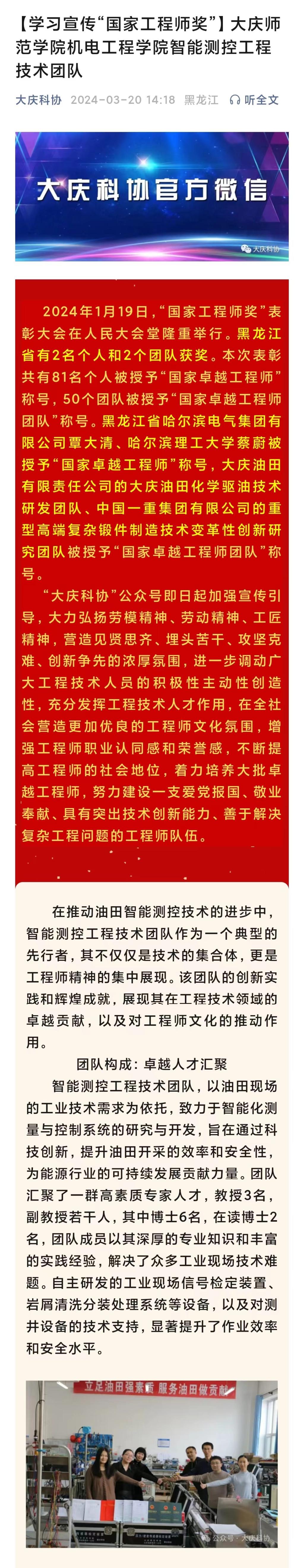 3月20日,“大庆科协”公众号以“学习宣传国家工程师奖-开云kaiyun体育开云kaiyun体育智能测控工程技术团队”为题,报道了开云官网刘开绪教授牵头组建的“智能测控工程技术团队”在油田智能化测量与控制系统的研究与开发中取得的成绩,对技术团队在科学研究、技术开发、队伍建设和科研反哺教学等方面的工作给予了很高的评价(全文链接:https://mp.weixin.qq.com/s/jt_SpQxC8BvpB8StJEdW9Q)。