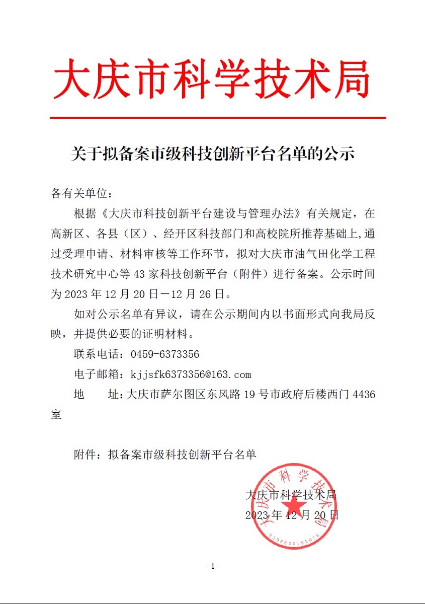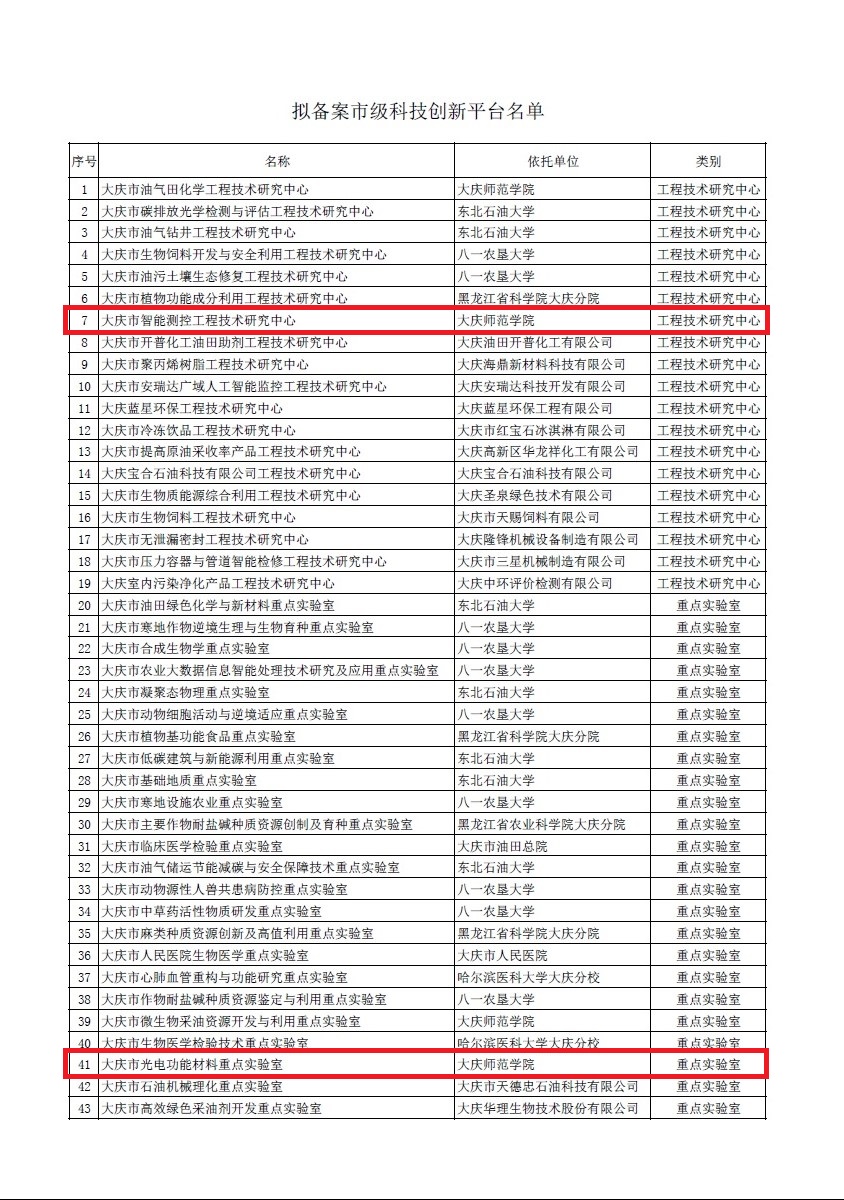 近日,大庆市科学技术局公布了市级科技创新平台名单,全市合计43家科技创新平台入选。开云官网申报的“大庆市智能测控工程技术研究中心”、“大庆市光电功能材料重点实验室”成功获批备案。