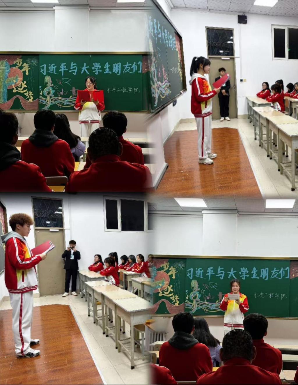 讲学:2024级物联网工程一班杨贺然同学向大家介绍习近平总书记与大学生们之间的温暖故事,伴随着她的讲述,每一个具有“画面感”的故事都映照出习近平总书记对青年的关怀厚爱,那些温暖细节使同学们感同身受。