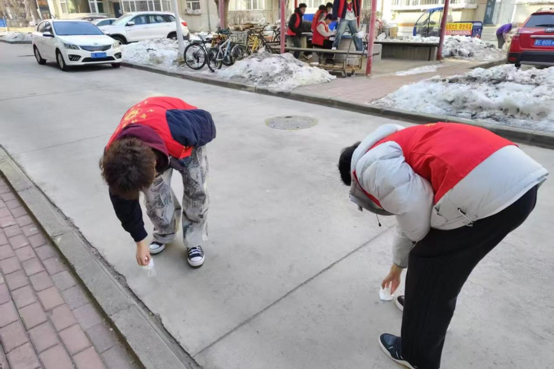 寒风中,青年志愿者的红马甲格外鲜艳。他们俯身用工具仔细清理地面杂物,不放过任何一个小垃圾。哪怕双手冻僵,也没有丝毫懈怠。每一次的弯腰,都是责任的践行,他们用实际行动为社区环境贡献力量!