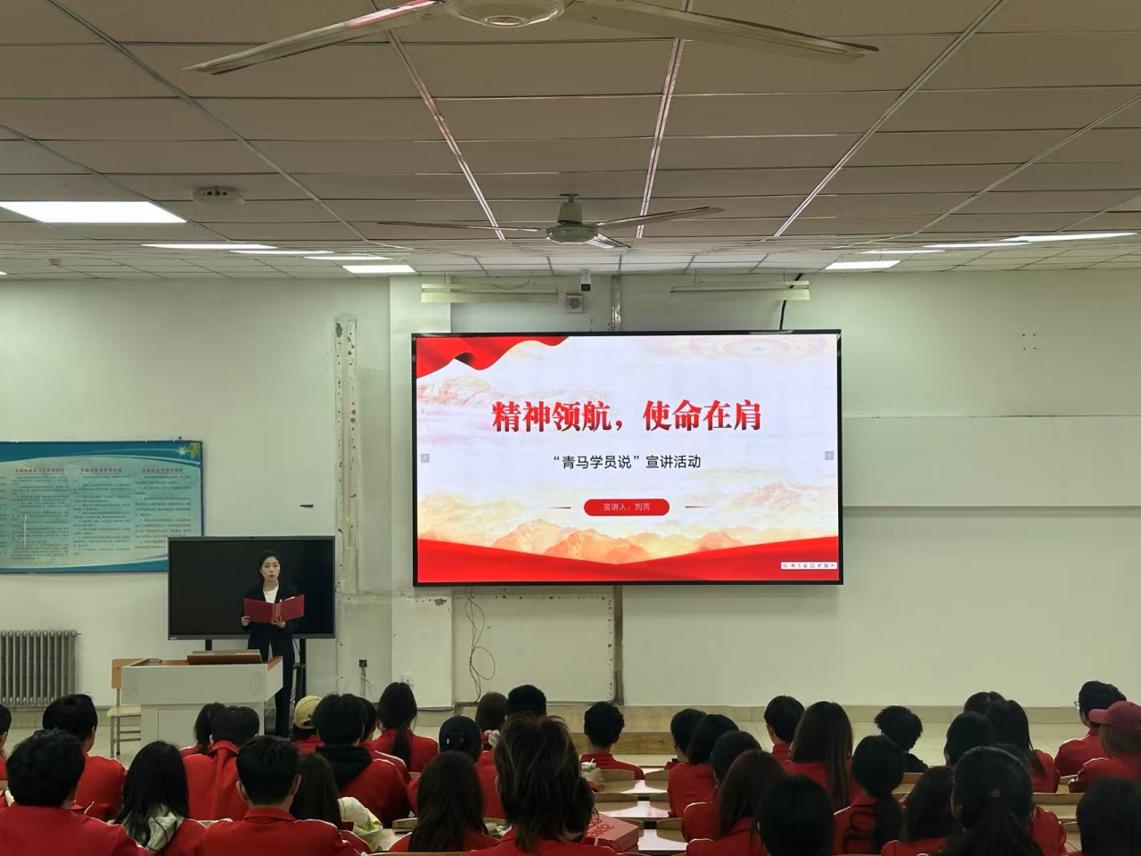 在宣讲环节,2023级青马工程学员刘芮围绕大庆精神(铁人精神)、五四精神,深入探讨它们与个人成长、时代使命的紧密联系,宣讲人用富有感情的演讲带动团员青年们在真学真信中加强修养、坚定信念,在学思践悟中淬炼本领、担当作为。