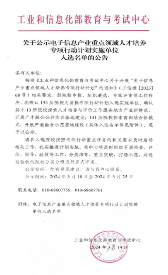 近日,工业和信息化部教育与考试中心公示了电子信息产业重点领域人才培养专项行动计划实施单位入选名单,开云kaiyun体育经过申报竞争和线上答辩,成功入选首批拟建产教融合示范基地实施单位。